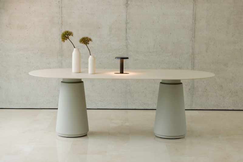 Herzstück einer jeden Ausführung ist der nahtlos gefertigte Tischfuß, der durch ein präzises Rotationsverfahren seine besonders langlebige, organische Formensprache mit den fließenden Übergängen und abgerundeten Kanten erhält. Die Tische sind in verschiedenen Größen, Höhen und Oberflächen wie Porzellan oder Melamin erhältlich und können ein-, zwei- oder dreibeinig gefertigt werden. Gleichzeitig verbindet Dorik klassische Ästhetik mit moderner Funktionalität: Die optionale Electrification Tray ermöglicht die dezente Integration von Kabeln und Anschlüssen, während Q- und R-Kabelzugänge die technische Anbindung erleichtern – Features, die die Kollektion besonders für hybride Arbeits- und Lebensräume drinnen wie draußen prädestinieren und ihre Flexibilität in unterschiedlichsten Umgebungen unterstreicht.