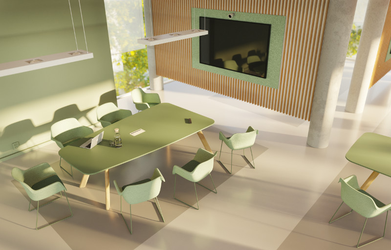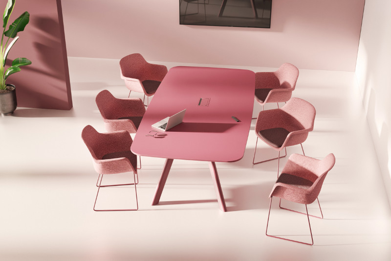 Das Unternehmen setzt mit dem ausgezeichneten Prodokt auf Sichtachsen statt Hierarchien. Spielt in der modernen Büroplanung die Form des Tisches eine zentrale Rolle, indem sie die Kommunikation strukturiert und die Wahrnehmung der Gesprächspartner:innen beeinflusst, sitzen bei der trapezförmigen Ausführung des Contact-Systems die Gesprächspartner:innen nur eingeschränkt einander zugewandt, so dass der Blick auf den Bildschirm frei bleibt und die Kamera alle Teilnehmer gut erfasst. So entsteht eine gleichberechtigte Gesprächssituation, in der sowohl physisch Anwesende als auch digitale Teilnehmer sichtbar, hörbar und ansprechbar sind. Die tonnenförmige Variante eignet sich hingegen besonders für analoge Besprechungen mit vielen Beteiligten. Sanft gerundete Tischkanten unterstützen den offenen Charakter des Austauschs, es gibt keine dominanten Kopfpositionen.