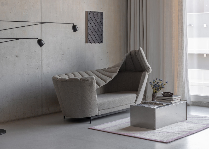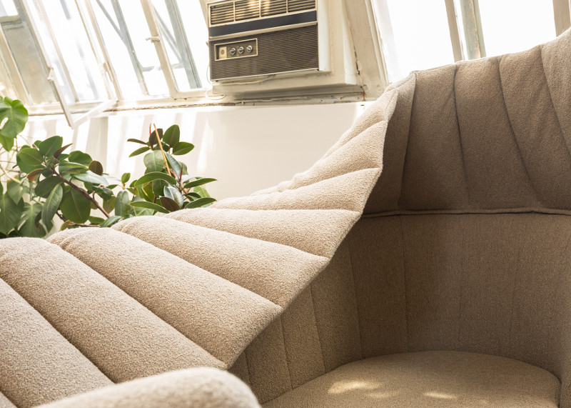 Zur Schlusspräsentation des Semesters entstand das erste 1:1 Modell aus Holz, Styropor, Pappe, den Beinen eines alten Sofas und einem selbstgenähten Stoffbezug. Peter Wagner erkannte das Potenzial und schlug vor, gemeinsam einen echten Prototypen zu entwickeln, der erstmals bei der Ausstellung „Workspace in Progress“ im Oktober 2021 im MAK Köln präsentiert wurde – der offizielle Startschuss auf der großen öffentlichen Bühne, dem bald die nächsten Schritte folgte. Die Serienentwicklung war komplex: Mehrere Prototypen wurden nötig, bis Proportionen, Scharniere, Polsterung und Stoffwelt perfekt aufeinander abgestimmt waren.