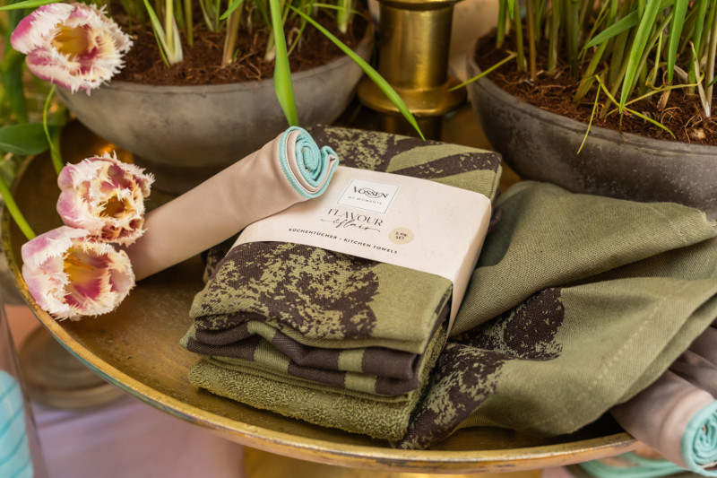 Die eigentlichen Stars: Die neuen VOSSEN-Küchentextilien. Diese kamen dabei zum Einsatz und wurden beim Kochen, Polieren und Servieren auf Herz und Nieren getestet.