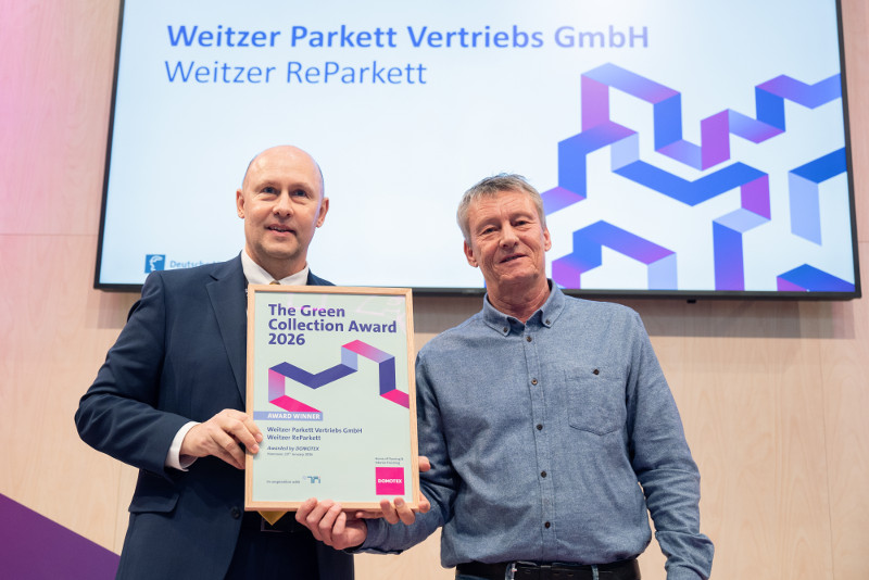 Ein besonderes Highlight der DOMOTEX 2026 war die Verleihung des Green Collection Award, mit dem in diesem Jahr Weitzer Parkett für seine herausragende nachhaltige Produktlösung Weitzer ReParkett ausgezeichnet wurde und sich als Wiederkehrer bei der DOMOTEX über viel Zuspruch freute.