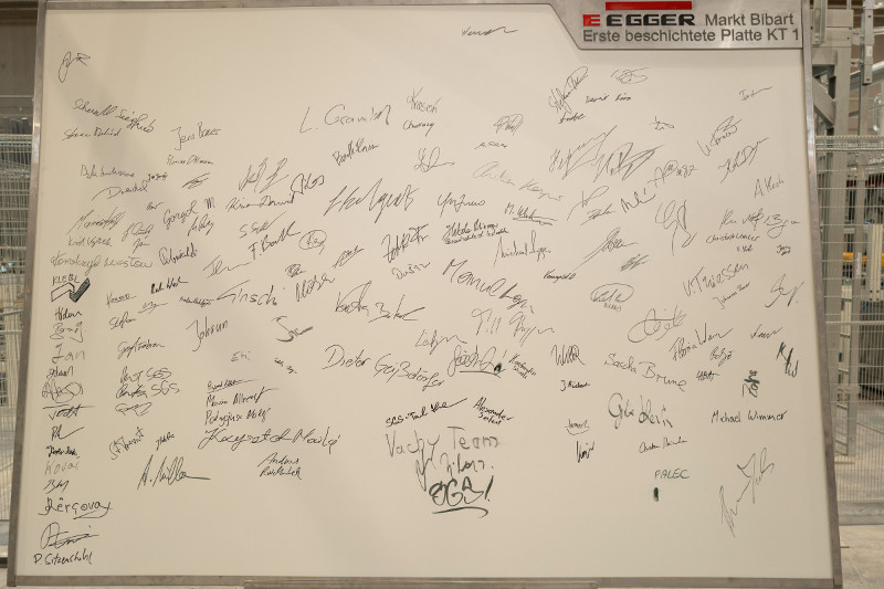 Die erste Kurztaktpresse nahm ihre Produktion auf und nach dem Richtfest der Produktionshalle im August sowie der reibungslosen Montage der Anlage startet nun die Beschichtung dekorativer Platten – ein Novum für den Standort, der bisher ausschließlich Rohspanplatten herstellte. Voller Freude und Stolz sind selbst die Eigentümer Michael und Fritz Egger zur historischen ersten beschichteten Platte nach Markt Bibart gereist.