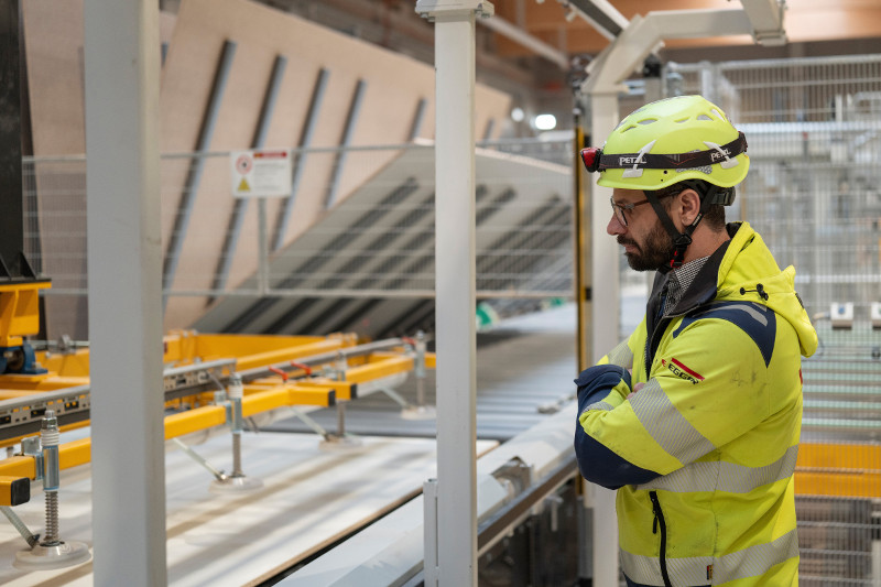 Die Schaffung von Veredelungskapazitäten ist eine große Neuerung im Werk. Der Standort produzierte bisher Rohspanplatten mit einer Kapazität von bis zu 650.000 m3 jährlich. Bestehende Kund:innen werden auch weiterhin verlässlich mit Rohspanplatten höchster Qualität beliefert. Ein Teil der Produktionsmenge wird ab sofort beschichtet.