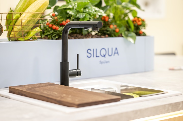 Naber präsentierte mit SILQUA ein herausragendes Spülendesign, das in mehreren Einbauvarianten, Materialien und Trendfarben verfügbar ist. Während die seitlichen Radien eng konzipiert sind, sind die Über gänge in der Fläche weich gerundet. Diese Details verringern die Putz arbeit sowie die Gefahr von Schlagschäden. Besondere Beachtung fand die Armaturenbank mit integrierter Abtropffläche, von der das Wasser sanft ins Becken herabfließt. Die Armatur ist mittig platziert, sodass die Hände beim Bedienen innen bleiben und keine Pfützen außerhalb des Beckens verursachen.