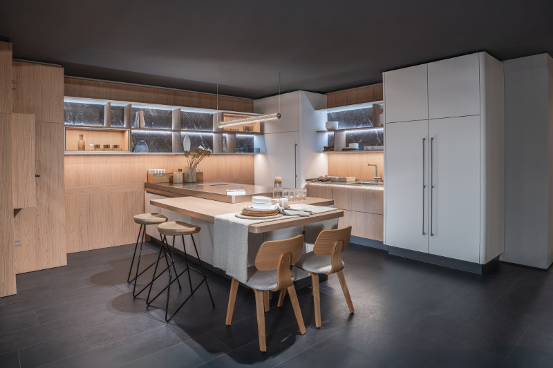 Zu den Highlights zählte eine im eigenen Stil entwickelte Japandi-Küche mit schmalem Massivholzrahmen und geprägtem Linoleum, das in 15 Farben und zwei Strukturen weiterentwickelt wurde und haptische sowie ästhetische Akzente in die moderne Raumgestaltung bringt.