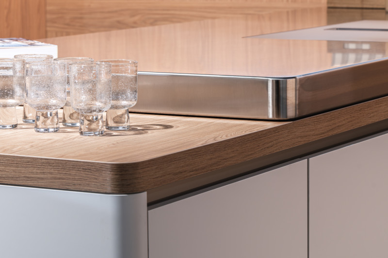 Als weiterer Blickfang erwiesen sich die individuell gefertigte Edelstahl-Arbeitsplatten mit flächenbündigen Kochfeldern und eingeschweißten Becken, erhältlich in zwei Materialstärken und drei Oberflächen.