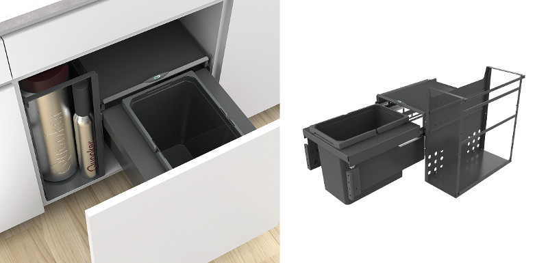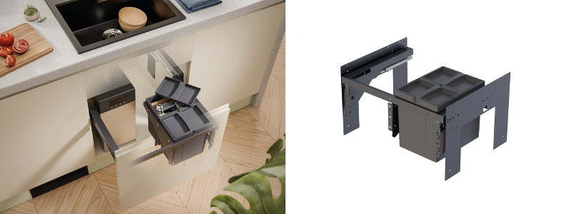 Im WESCO® Auszugssystem Pullboy Soft Fusion® wird das Equipment für die Wasserkonditionierung links von den Abfallbehältern platziert. Dort bleibt es sicher positioniert, wenn der oder die Abfallbehälter herausgezogen werden und wenn sie sanft und gedämpft wieder in den Schrank einfahren. In der Systemhöhe 320 Millimeter steht neben der 17-Liter-Einzelbehälter-Variante auch die Zwei-Behälter-Ausführung mit insgesamt 16 Litern Abfallvolumen zur Verfügung. Die Systemhöhe 480 Millimeter sieht ein Einzelbehälter-Volumen von 29 Litern vor. Deckel für die Behälter gehören zum Lieferumfang.
