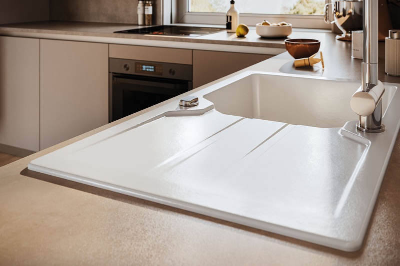 Wie alle Spülen von systemceram wird auch die „Solva 80“ aus robustem Feinsteinzeug gefertigt. Die bei rund 1.220 °C gebrannte, porenfreie Oberfläche ist hygienisch, kratzfest, hitzebeständig und pflegeleicht. Lebensmittelreste und Kalk haften kaum an. Ursprünglich für den Laboreinsatz entwickelt, zeigt das Material im Küchenalltag besondere Stärken. Zudem ist Feinsteinzeug nahezu vollständig recyclingfähig; die Rohstoffe stammen überwiegend aus der unmittelbaren Umgebung des Produktionsstandorts Siershahn im Westerwald.