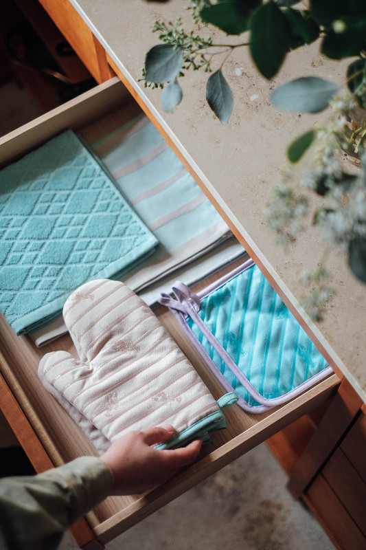 Bekannt dafür, neue Wege zu beschreiten, gelingt der für Innovation und Fortschritt bekannten Premium Brand mit FLAVOUR & FLAIR der nächste große Coup und wie immer werden Qualität, Style und Funktionalität gekonnt verwoben. Pflegeleicht, frisch und alltagstauglich, vereinen die Küchentücher all dies in schönster Form. Feinstes Glattgewebe aus 100% Baumwolle sorgt für eine angenehme Weichheit und hohe Saugfähigkeit, die Küchenschürze sorgt sowohl optisch für Freude wie auch praktisch, denn mit komfortablen Taschen, einer Tasche für den Probierlöffel und verstellbaren Bändern für individuellen Sitz macht sie es leicht, Ordnung und Komfort zu bewahren – und das Kochen ebenso zu einem besonderen Erlebnis wie die FLAVOUR & FLAIR Topflappen und Ofenhandschuhe, die zuverlässig vor Hitze schützen, dank ihrer rutschfesten Silikonfläche für sicheren Halt sorgen – selbst bei hohen Temperaturen – und zudem mit durchdachtem, coolem Design punkten. Abgerundet wird die Kollektion durch Spül- und Poliertücher aus Mikrofaser.