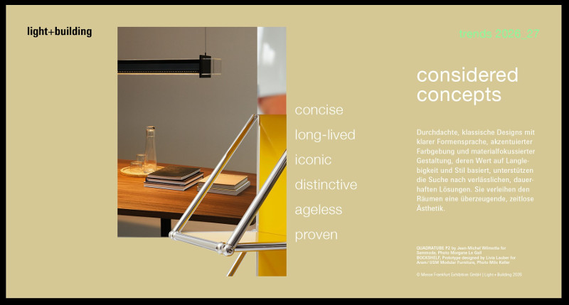 Hier setzen Leuchten ein markantes Statement für Materialbewusstsein, zeitlose Ästhetik und langlebige Gestaltungen. Die klassischen wie innovativen Designkonzepte vereinen prägnant dekorative Aspekte mit technologischer Raffinesse. Sie zeigen, wie durchdachte Leuchten-Objekte über die bloße Funktion hinausgehen können und wandelbar mit funktionalem als auch stimmungsvollem Licht die Räume elegant veredeln. Auffallend viele Gestalter beschäftigen sich mit bewährten Klassikern oder wählen Retro-Zitate für ihre neuen Designs. Sie erwecken Klassisches zu neuem Leben, es entstehen Neuinterpretationen früherer Arbeiten oder es kommt zu Neuauflagen und zu Neugestaltungen aus den Archiven der Hersteller. Die Farbpalette bringt Kolorite mit markanter Präsenz, zurückhaltende Töne und klare Neutrale zusammen. Mit klaren Formen und materialfokussierter Gestaltung wird der Blick auf starke, bewährte und langlebige Werkstoffe gelenkt. Kühle, cleane Metalle und Marmor begleiten den zeitlosen Stil und werden immer wieder neu definiert – etwa wenn recyceltes Silber edlen Glanz hervorbringt.