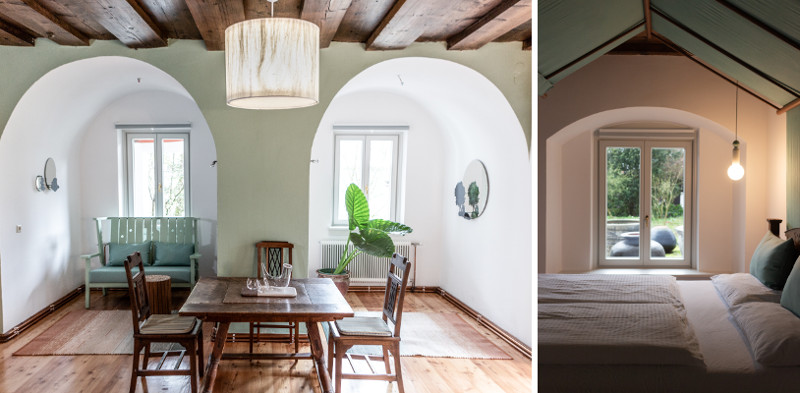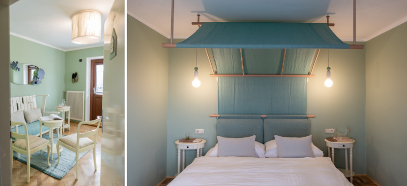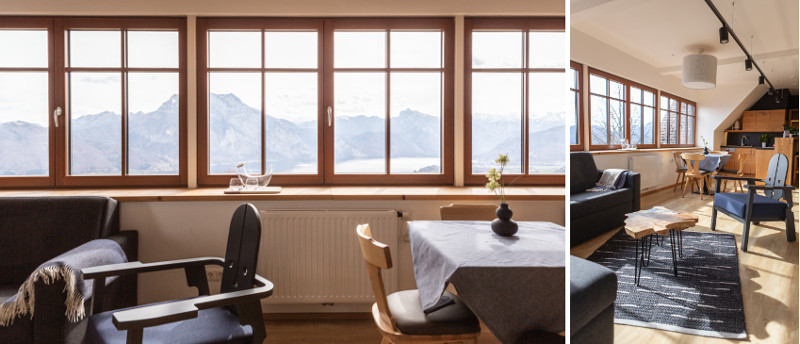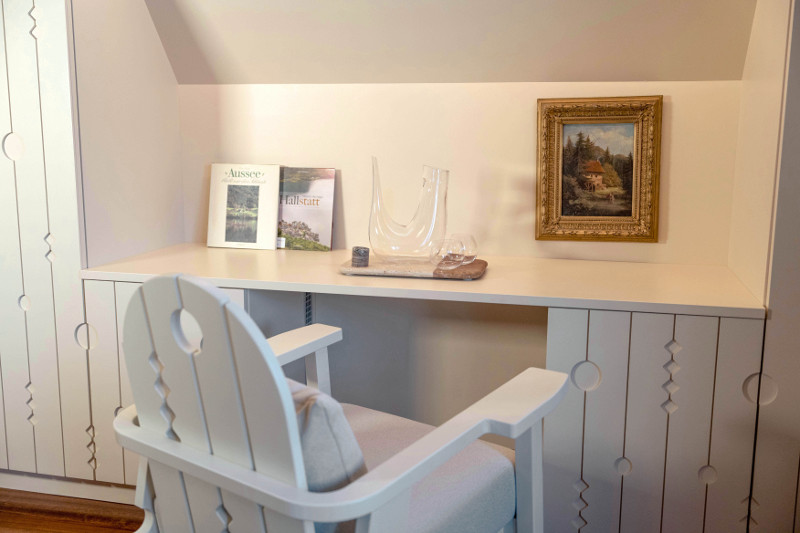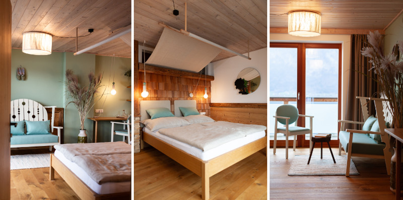 Jedes Zimmer ist mit denselben Objekten ausgestattet und gemeinsam ist ihnen, die durch diese gleichen, nachhaltig gestalteten Designobjekte und regionale Materialien zeitgenössische und autochthone, also für das Salzkammergut typische, Formensprache. Gleichzeitig haben sie alle auch eine individuelle Optik, weil ja die Unterkünfte und die Grundrisse unterschiedlich sind. Für die farbliche Stimmigkeit haben wir eigens eine Salzkammergut-Farbpalette mit Farben von Farrow&Ball kreiert. Damit hat jedes Zimmer ein eigenes Ambiente und Gäste können immer ein anderes „Zimmer mit Aussicht“ genießen.