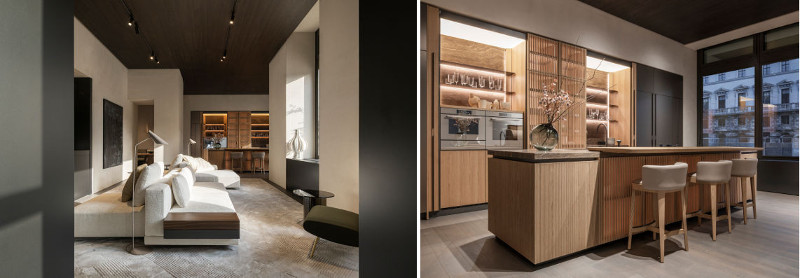 Er ist damit Bühne für Design in ganz großem Stile. Konzeptionell ist der Flagship-Store eine Hommage an die großen Pioniere der Architektur- und Designgeschichte und präsentiert Entwürfe international renommierter Architekten und Designer wie Vincent Van Duysen, Herzog & de Meuron, Foster + Partners, Jean Nouvel, Gio Ponti, Tobia Scarpa und Christophe Delcourt, stilsicher und modern in einer Raumfolge inszeniert, die das Gefühl eines ruhigen, einladenden Zuhauses, geprägt von Klarheit, Wärme und einer zeitlosen Formensprache, vermittelt. Dieses Gefühl durchzieht jeden Winkel des fast 400 Quadratmeter großen Stores, der, verteilt auf zwei Etagen inklusive Außenbereichen, von Wohn- über Küchen- bis zu Essbereichen alles zeigt, was das designaffine Herz höher schlagen, die Besucher:innen vollständig in den zeitlosen italienischen Stil von Molteni&C eintauchen lässt und die Kultur des gehobenen Wohnens fördert.